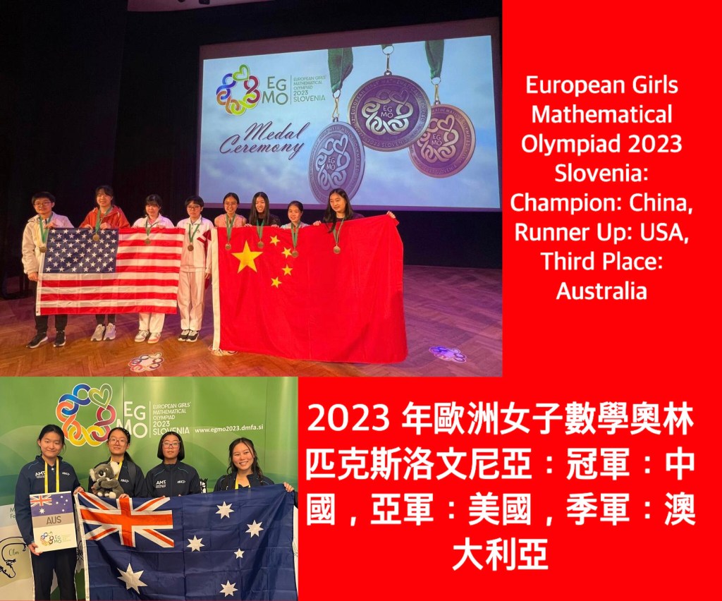 European Girls Mathematical Olympiad 2023 Slovenia: Champion: China, Runner Up: USA, Third Place: Australia 2023 年歐洲女子數學奧林匹克斯洛文尼亞:冠軍:中國,亞軍:美國,季軍:澳大利亞