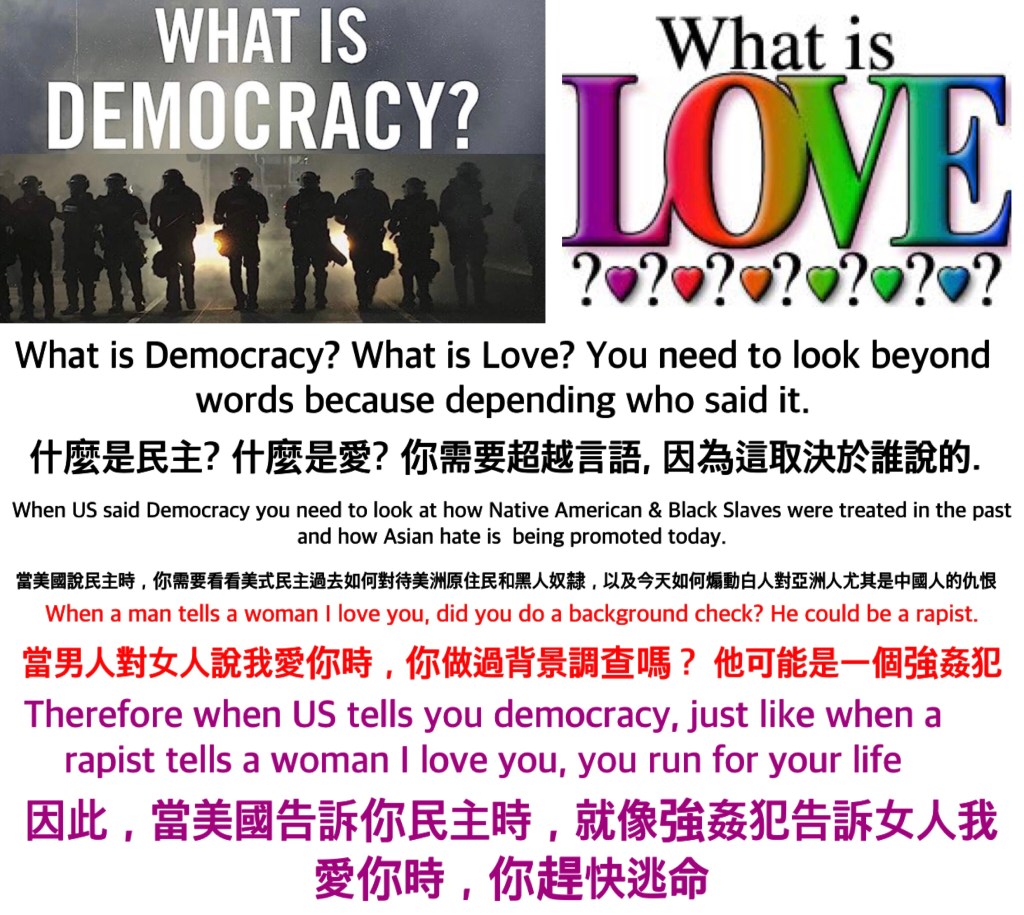 What is Democracy? What is Love? You need to look beyond words because depending who said it. 什麼是民主? 什麼是愛? 你需要超越言語, 因為這取決於誰說的.