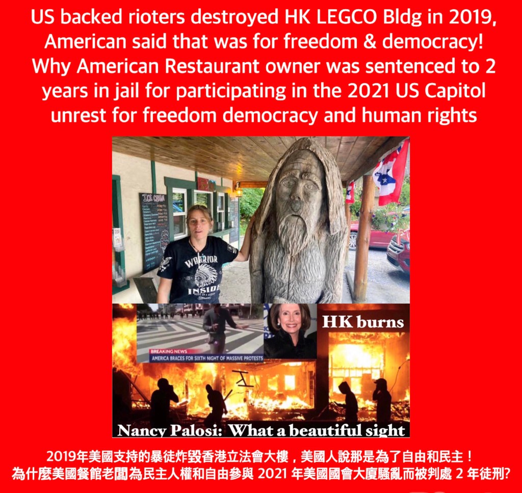 US backed rioters destroyed HK LEGCO Bldg in 2019, American said that was for freedom & democracy! Why American Restaurant owner was sentenced to 2 years in jail for participating in the 2021 US Capitol unrest for freedom democracy and human rights? 2019年美國支持的暴徒炸毀香港立法會大樓,美國人說那是為了自由和民主!為什麼美國餐館老闆為民主人權和自由參與 2021 年美國國會大廈騷亂而被判處 2 年徒刑?