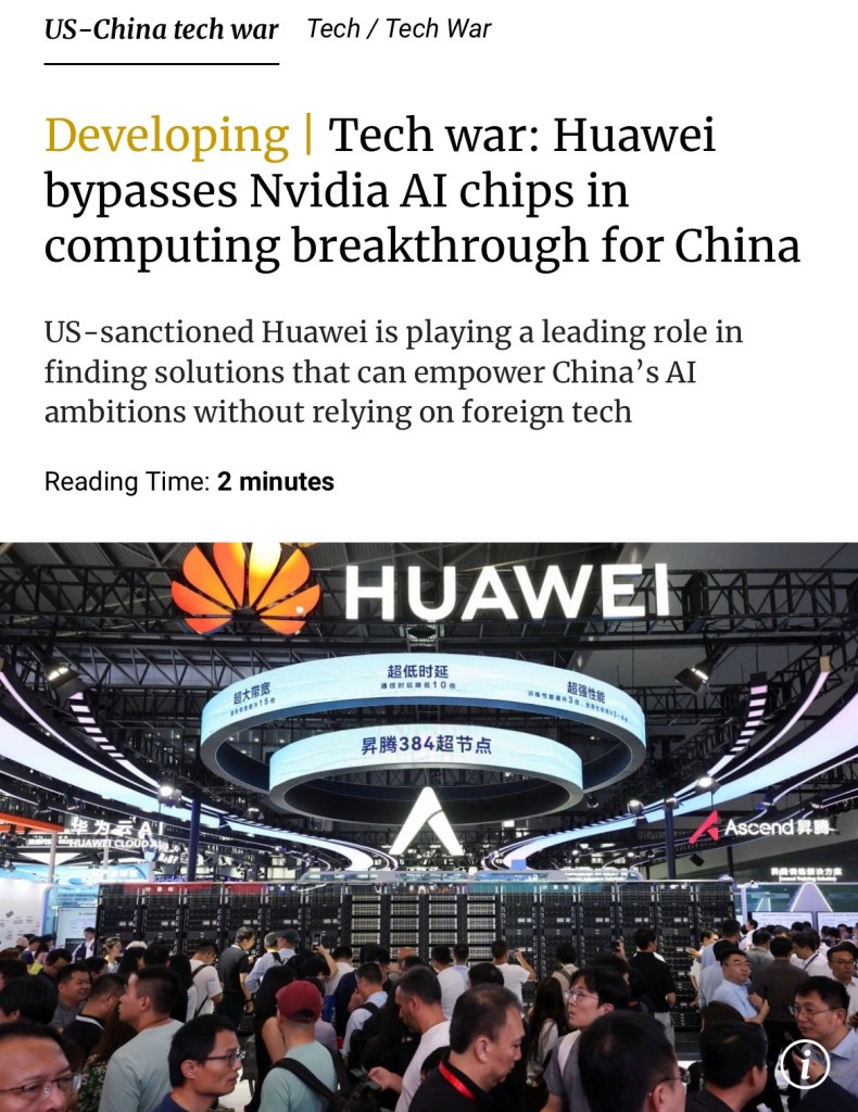 SCMP: Huawei bypasses Nvidia AI chips in computing breakthrough for China! Huawei Technologies unveiled hardware that it could deliver world-class computing power without using Nvidia’s advanced chips providing a boost to the country’s self-reliance in AI computing 《南華早報》:華為超越英偉達,協助中國人工智慧運算取得突破! 華為科技公司推出的硬體無需使用 Nvidia 的先進晶片即可提供世界一流的運算能力,為中國在人工智慧運算領域的自主發展提供了助力 https://www.scmp.com/tech/tech-war/article/3325942/tech-war-huawei-bypasses-nvidia-ai-chips-computing-breakthrough-china?