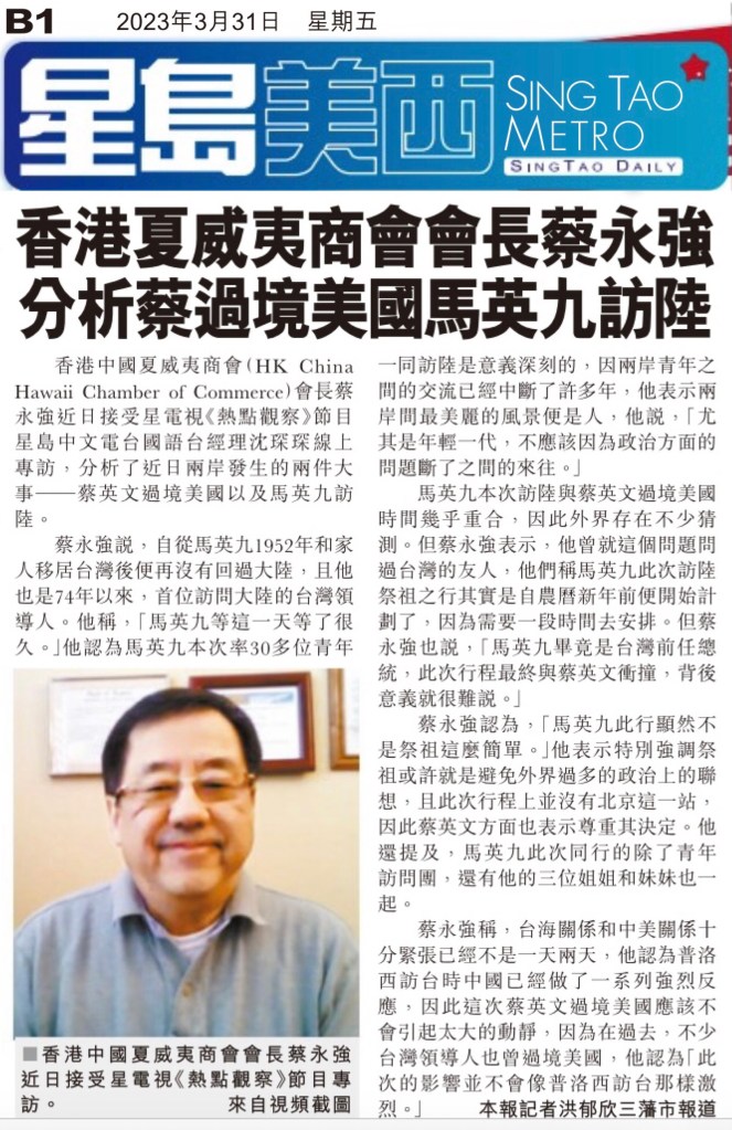 香港中國夏威夷商會(HK China Hawaii Chamber of Commerce)會長蔡永強近日接受星電視《熱點觀察》節目星島中文電台國語台經理沈琛琛線上專訪,分析了近日兩岸發生的兩件大事——蔡英文過境美國以及馬英九訪陸。