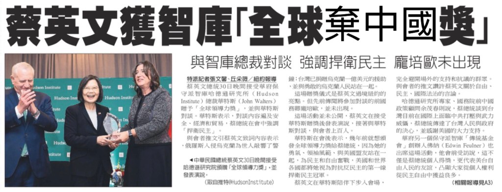 Under US leadership, English Tsai tirelessly promotes China hate in Taiwan, US think tank offer her world’s only award [International China Hate Award] 在美國的領導下努力在台灣推動仇中棄中, 為表揚她的一生努力所以為她製造了全球唯一的[全球棄中賣台獎]
