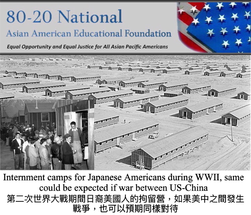 Internment camps for Japanese Americans during WWII, same could be expected for Chinese-Americans if war between US-China 第二次世界大戰期間日裔美國人的拘留營,如果美中之間發生戰爭,美國華人也可以預期獲得同樣對待