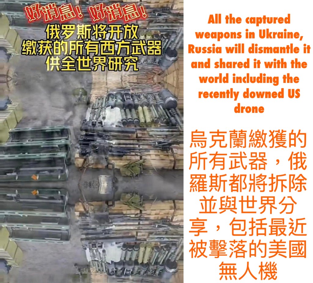 All the captured weapons in Ukraine, Russia will dismantle it and shared it with the world including the recently downed US drone 烏克蘭繳獲的所有武器,俄羅斯都將拆除並與世界分享,包括最近被擊落的美國無人機