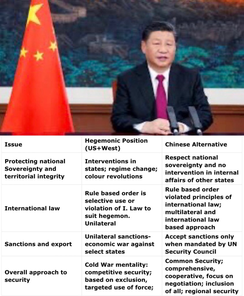 The first ‘Global Security Initiative’ (February 21, 2023) [i] is a vision paper that calls for ‘common security’ which should be comprehensive, cooperative ad sustainable unlike competitive security. This paper continues with earlier appeals made by President Xi Jinping for negotiated settlements to all conflicts, opposes unilateralism and hegemonism. This paper presents an international alternative to the hegemonic vision on geopolitics- shown in the Table.