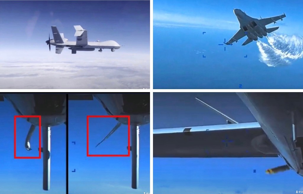 Video: NYT – Pentagon released video footage of a Russian jet spraying a substance on an US drone while spying on Russian Military Base before it crashed in the Black Sea. 紐約時報:五角大樓發布了一段視頻,顯示一架俄羅斯噴氣式飛機向一架美國無人機在偵察俄羅斯軍事基地時噴灑了一種物質,然後墜毀在黑海