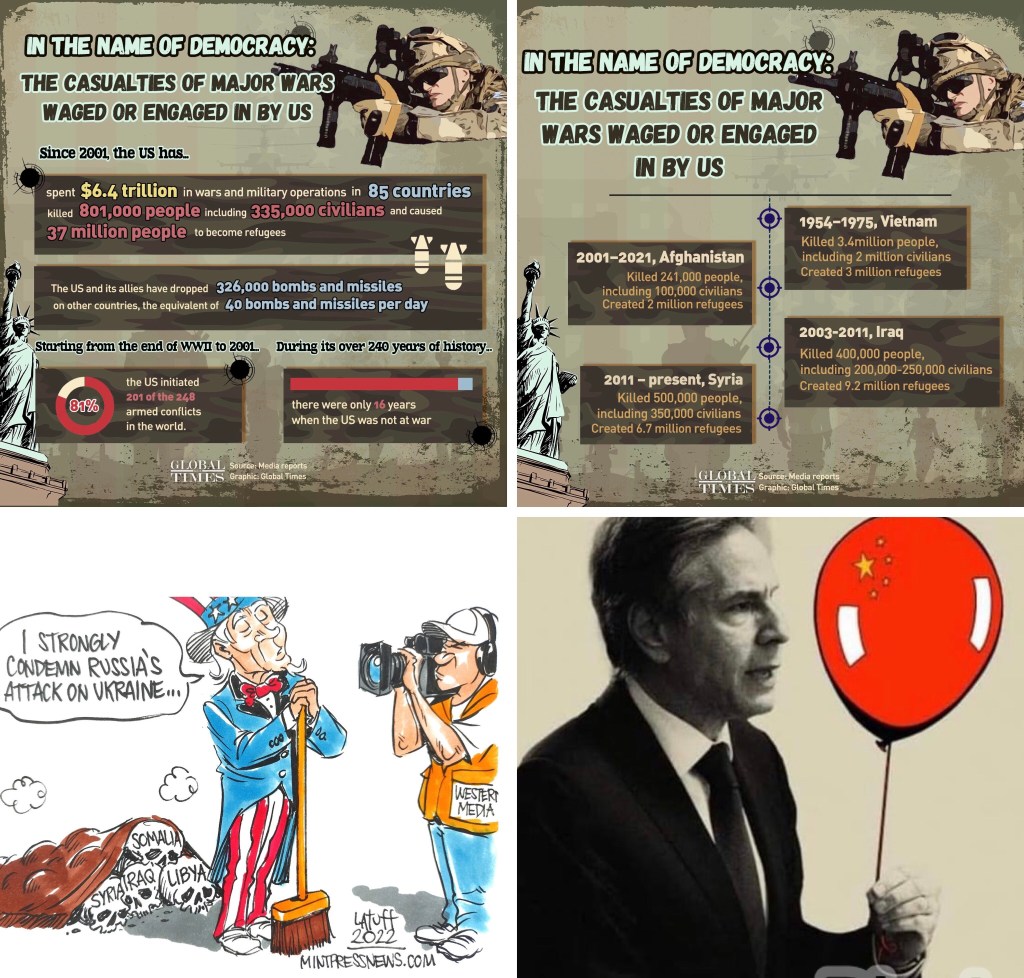 Alex Lo, a South China Morning Post columnist, pointed out that the United States has rarely distinguished between diplomacy and war since its founding. It overthrew democratically elected governments in many developing countries in the 20th century and immediately replaced them with pro-American puppet regimes. Today, in Ukraine, Iraq, Afghanistan, Libya, Syria, Pakistan and Yemen, the United States is repeating its old tactics of waging proxy, low-intensity, and drone wars.