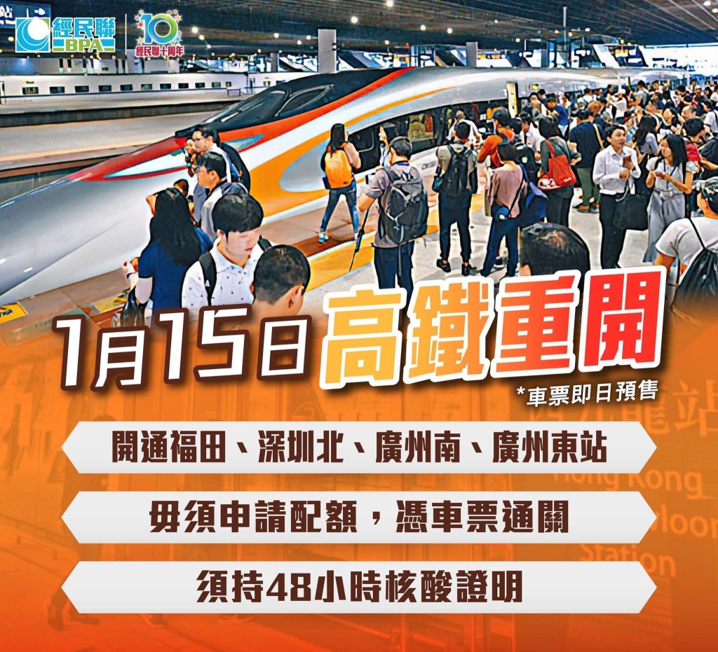 📣The government stated that the West Kowloon Port of the High Speed Rail and the Hong Kong Section of the High Speed Rail will resume service from January 15th. Tickets will be pre-sold from now on, with 5,000 tickets for northbound and southbound each day.