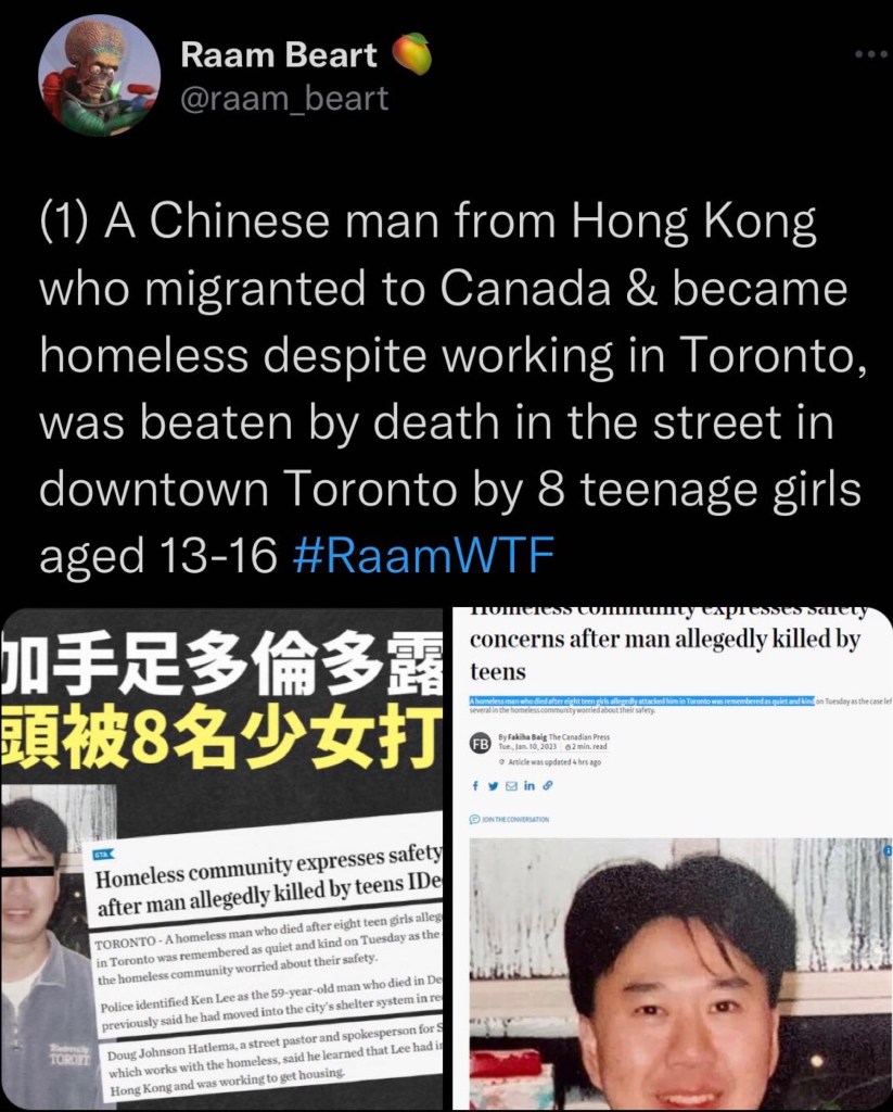 Moved from Asia’s World City HK to racist N America paid the ultimate price, his life! Toronto police named the victim as 59-year-old homeless Ken Lee from HK and revealed that he was killed trying to prevent the teens from stealing a bottle of liquor. 從亞洲的世界城市香港搬到種族主義的北美州付出了最終的代價,他的生命, 真笨! 多倫多警方將受害人命名為來自香港的 59 歲無家可歸者 Ken Lee,並透露他是在試圖阻止這些青少年偷一瓶酒時被殺的. https://nypost.com/2023/01/11/ken-lee-idd-as-homeless-toronto-man-killed-by-8-swarm-of-teen-girls/