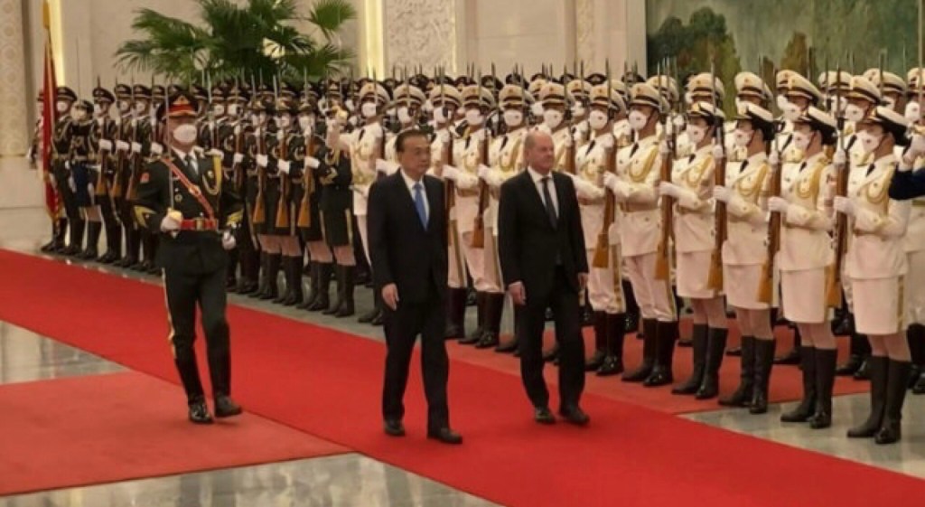 Chinese Premier Li Keqiang receives German Chancellor Olaf Scholz at the Great Hall of the People in Beijing. Scholz is the first G7 leader to visit China since the start of the coronavirus pandemic, which has seen the world’s number two economy largely close its borders. 中國國務院總理李克強在北京人民大會堂會見德國總理奧拉夫·舒爾茨。舒爾茨是自冠狀病毒大流行開始以來第一位訪問中國的七國集團領導人,全球第二大經濟體在很大程度上關閉了邊界.