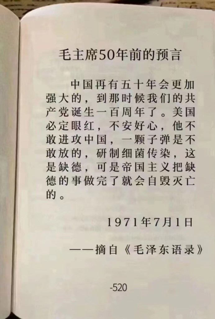 Chairman Mao’s predictions 50 years ago: CPC will be very strong in 50 years made US extremely jealous. But US will not dared to invade China, but germ warfare against China shall became an US option – Jul 1 1971