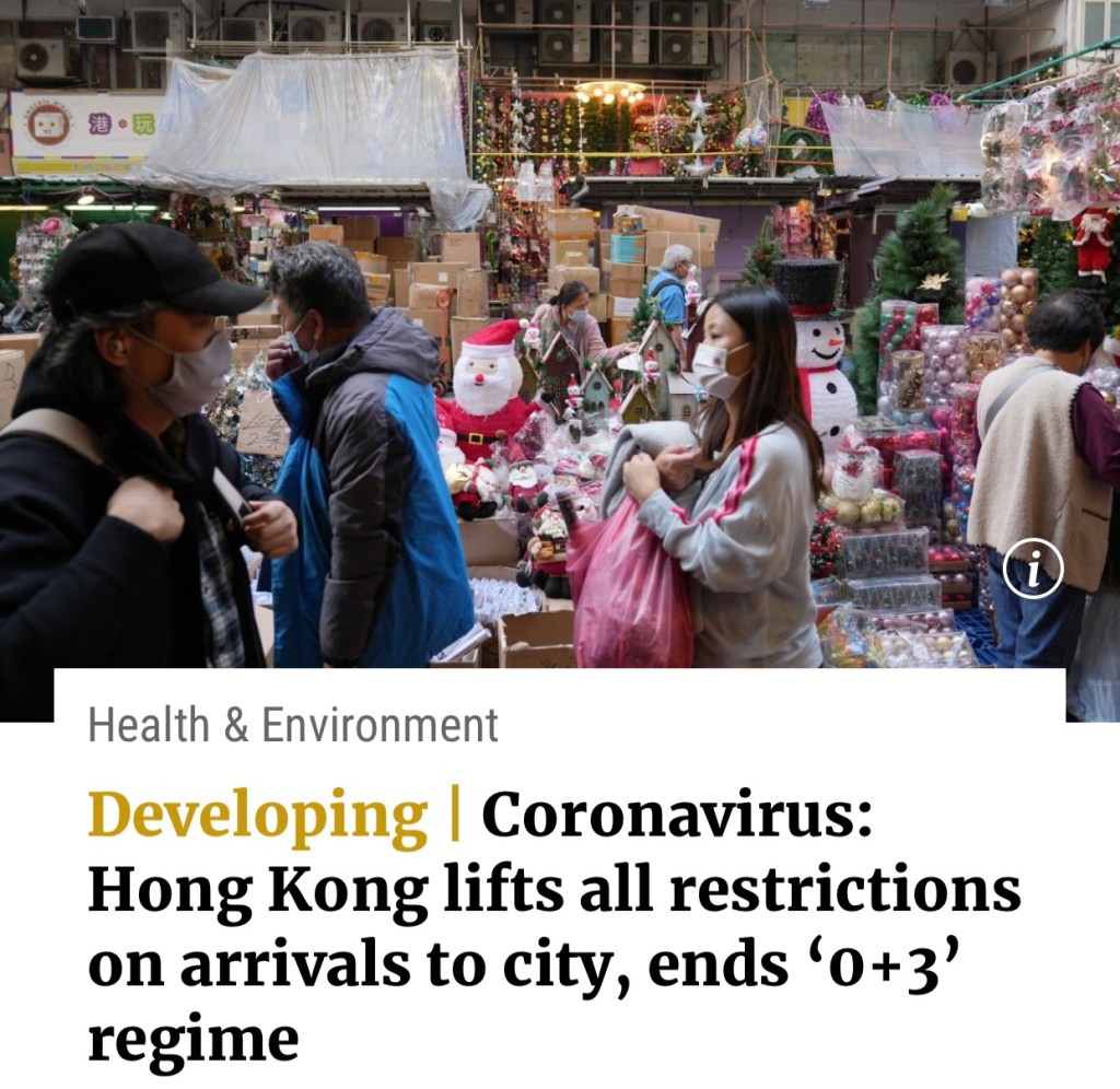 My bets paid off! I can return home, HK here I come! SCMP: Hong Kong lifts all restrictions on arrivals to city, ends ‘0+3’ regime. Arrivals from Wednesday Dec 14 2022 who test negative will no longer need an amber health code and can enter restaurants and other premises previously off limits to them 我的賭注得到了回報! 可以回家了! 南華早報:香港取消所有入境限制,結束“0+3”制度。從 2022 年 12 月 14 日星期三起抵達的測試呈陰性的人將不再需要安珀健康碼,並且可以進入以前禁止他們進入的餐廳和其他場所
