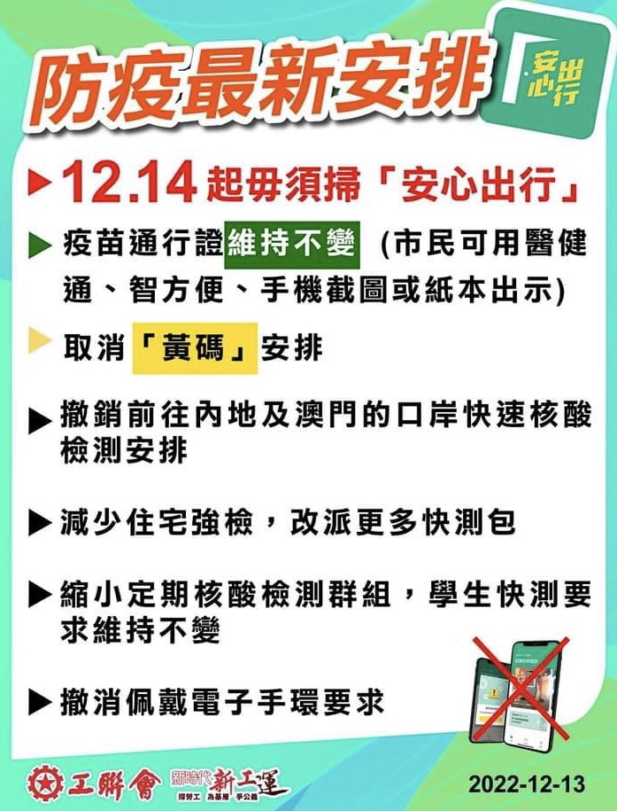 Health Secretary Lo Chung-mau announced that COVID-19 test points at ports to the mainland and Macao will be scrapped on Tuesday, which means travelers to the mainland and Macao will be exempted from pre-departure testing at immigration control points, and only need to present a negative result of a nucleic acid test taken within 48 hours before the travel.