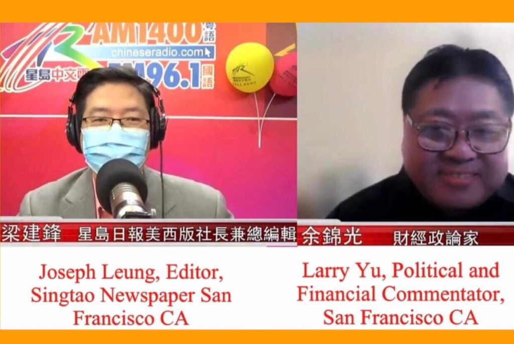Singtao SF TV Video: American’s dream is only for AngloSaxon, Chinese dream is for the world. By Larry Yu Dec 13 22 https://youtu.be/39PcuYB2_Ew 時事觀察集結號:美國夢是西人夢, 有色人種無份, 要全球七十億人口支持他們十億人口. 中國夢開始變成全球夢, 人類命運共同體. 嘉賓:財經政論家余錦光 主持:星島日報美西版社長兼總編輯梁建鋒