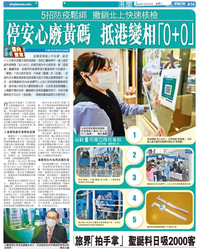 Hong Kong on Tuesday December 13th said the city was scrapping the requirement for nucleic acid testing at airport and border control points before visiting the Chinese mainland and Macao. The same day, the city also announced to scrap its amber health code from Wednesday, effectively lifting all travel restrictions for arrivals into the city who test negative.