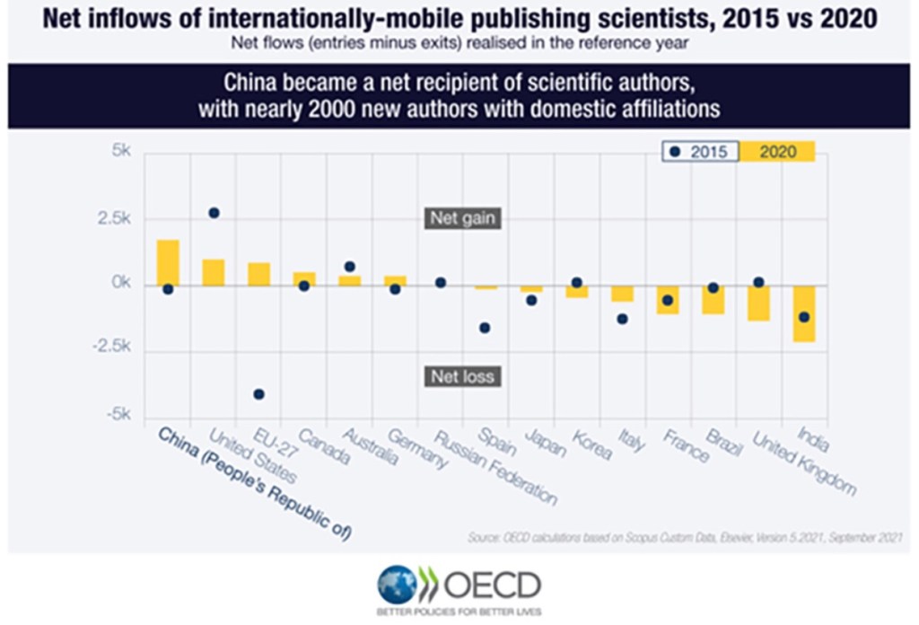 In the same period, China went from losing scientists, to replacing the US as the world’s most attractive destination. In 2020, a net total nearly 1,800 academics relocated to the country.