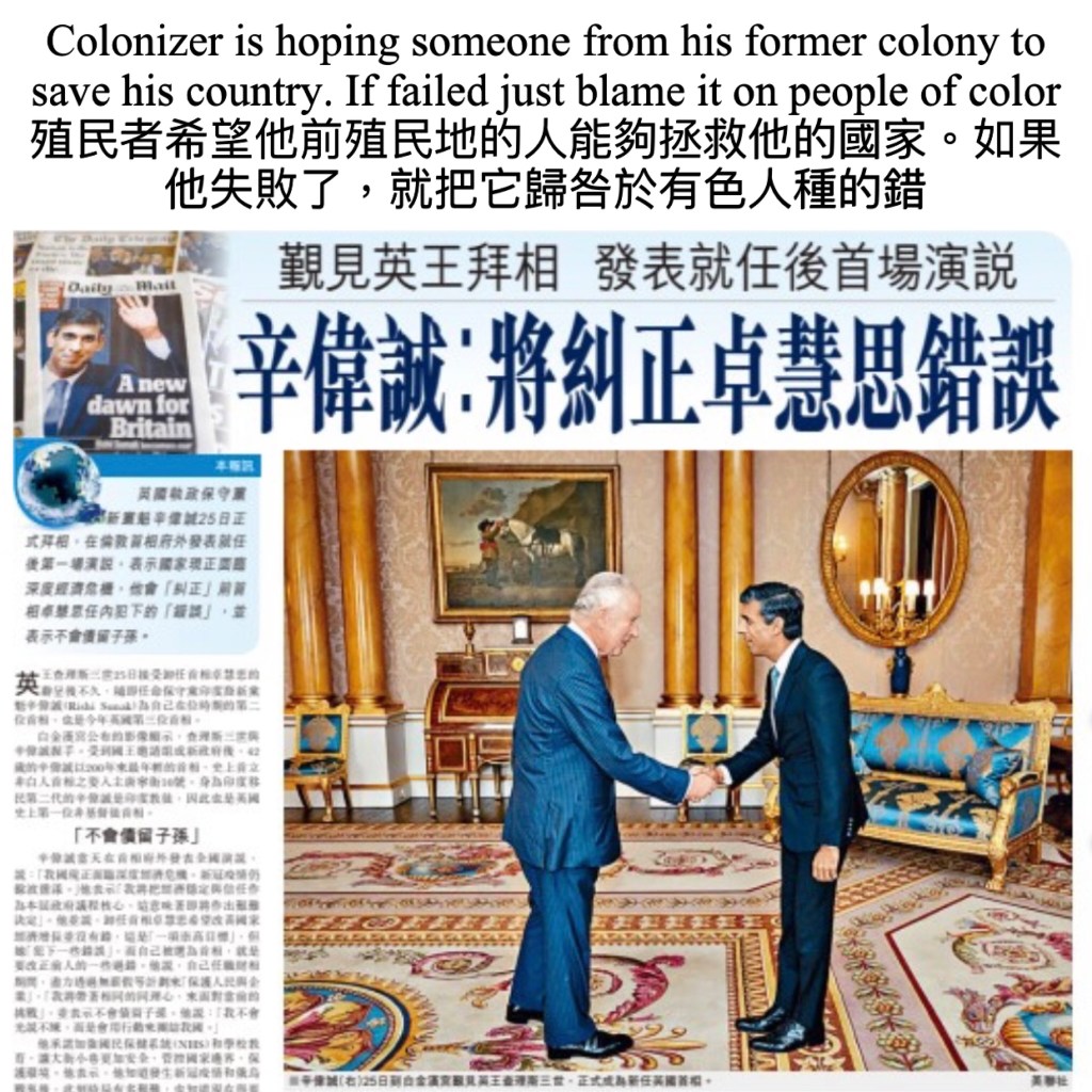 Colonizer is hoping someone from his former colony to save his country. If failed just blame it on people of color 殖民者希望他前殖民地的人能夠拯救他的國家。如果他失敗了,就把它歸咎於有色人種的錯