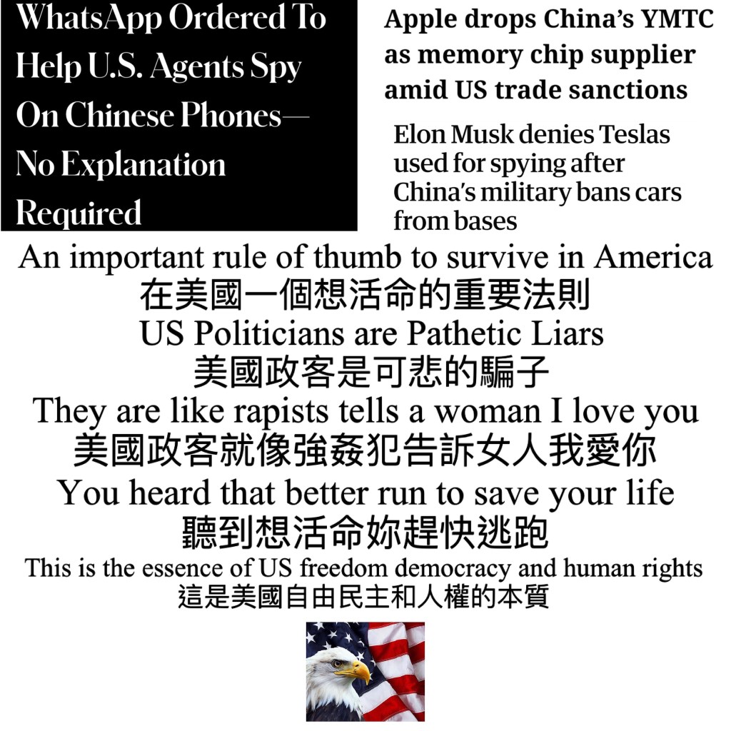 An important rule of thumb to survive in America 在美國想活命的一個重要法則 US Politicians are Pathetic Liars 美國政客是可悲的騙子 They are like rapists tells a woman I love you 美國政客就像強姦犯告訴女人我愛你 You heard that better run to save your life 聽到想活命妳趕快逃跑 This is the essence of US freedom democracy and human rights 這是美國自由民主和人權的本質