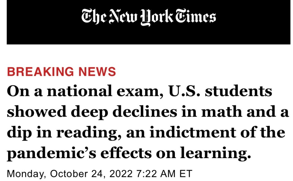 NYT Breaking News: Math scores fell in every state, reading dipped on national exam when US kept spent more money on war machines not education, 70 billions in 2022 on our proxy war against Russia in Ukraine 紐約時報突發新聞:美國每個州的數學成績都在下降,當美國繼續花錢在戰爭機器而不是教育上, 閱讀在全國考試中下降,2022 年我們在烏克蘭對俄羅斯的代理戰爭已經花費了700億美元.