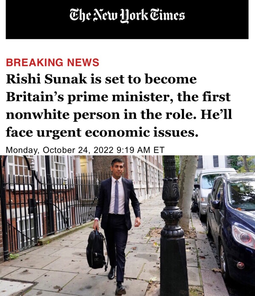 NYT Breaking News: Rishi Sunak is set to become Britain’s next PM. India, former colony not only overtaken British in terms of GDP, now hoping their new Indian PM could save them 紐約時報突發新聞:Rishi Sunak 將成為英國的下一任首相. 印度, 前英國殖民地不僅在 GDP 方面超過了英國,現在希望他們的新印度首相能夠拯救日落的英國.