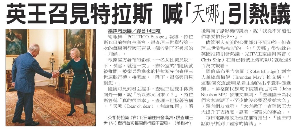 King Charles said “dear oh dear” after shaking Liz Truss hand, fresh memories that his mom dead in 48 hours after shaking her hand. Chill from his spine whether he will be next. 查爾斯國王在與特拉斯握手後說“親愛的, 親愛的”,他的媽媽和她握手後48小時內死去的記憶猶新. 他心想是否會成為下一個,他的脊椎都發冷了.