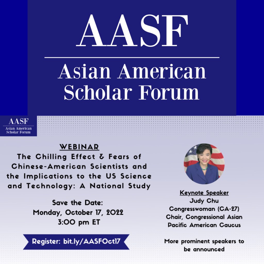 On September 23, 2022, the Asian American Scholar Forum (AASF) released a report entitled, “Caught in the Crossfire: Fears of Chinese-American Scientists,” showing a growing number of Chinese-descent scientists have left or are considering leaving the U.S. to take positions in foreign countries and are avoiding federal grant applications. This is due to fears and an unwelcoming environment in the U.S. The Wall Street Journal and other prominent media reported on the study, highlighting widespread fear among the Chinese American and immigrant community and the risk of losing talent in the U.S.