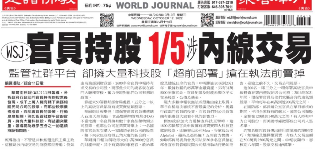 Wall Street Journal: US Gov’t Officials 1/5 of them involved insiders trading. Since they are above the law, no one get prosecuted. 華爾街日報:美國政府官員 1/5 涉及內幕交易。由於他們凌駕於法律之上,因此沒有人受到起訴.