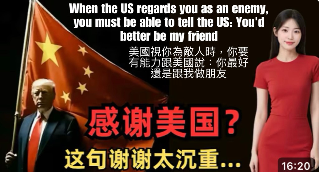 Video with English subtitles: When the US regards you as an enemy, you must be able to tell the US: You’d better be my friend 視頻有中文字幕: 美國視你🇨🇳為敵人時,你要有能力跟美國🇺🇸說:你最好還是跟我🇨🇳做朋友, 否則你🇺🇸可能面臨沒頂之災