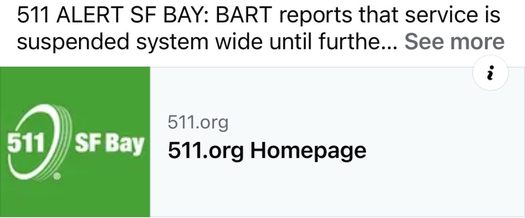 511 ALERT SF BAY: BART reports that service is suspended system wide until further notice, due to a computer equipment problem. Updates at https://511.org If that happens in HK, millions of dollars of penalties per hour for disruption in service. Mass Transit must also provide bus services to passengers! In US no penalties and no one lost their jobs for their incompetence 511 警報舊金山灣區:灣區捷運報告稱,由於電腦設備故障,全系統服務暫停,直至另行通知。更新資訊請造訪 https://511.org。如果這種情況發生在香港,每小時將因服務中斷而面臨數百萬元的罰款。公共交通系統也必須為乘客提供巴士服務!在美國,無人因服務不力而受到懲罰,也沒有高管無能而失業!