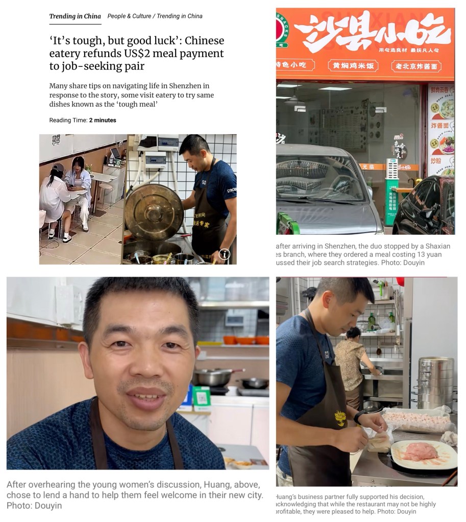 SCMP: A moving story in Shenzhen China. A street snack eatery in Shenzhen refunded 13 yuan (US$2) to uplift two young university graduates new to the city, and the gesture moved many people online. 《南華早報》:發生在中國深圳的一件感人事蹟。深圳一家街頭小吃店為兩位初來乍到的年輕大學畢業生退還了13元(約2美元),這一舉動感動了網路上的許多人.