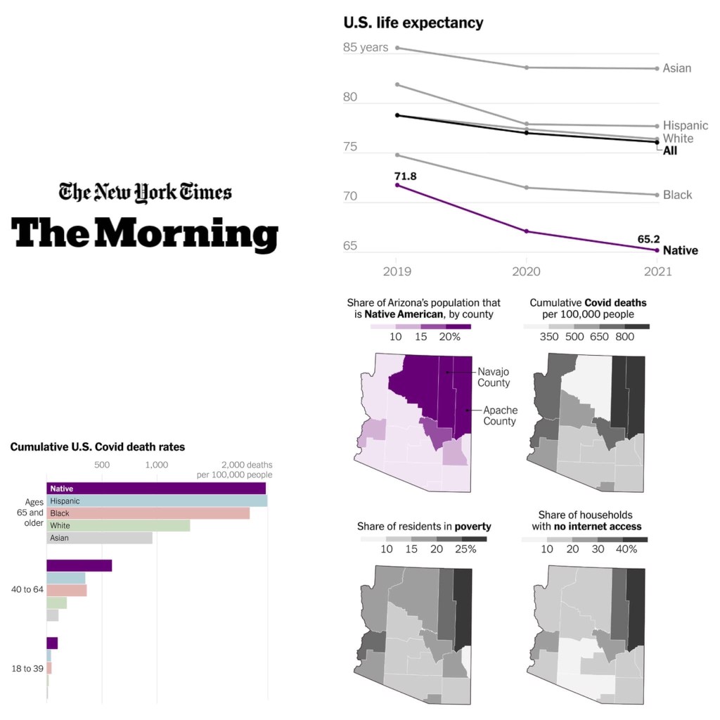 That loss has been tragically common among Native Americans, the C.D.C. revealed last week: From 2019 to 2021, their life expectancy fell from 71.8 years to 65.2. Covid was largely to blame.