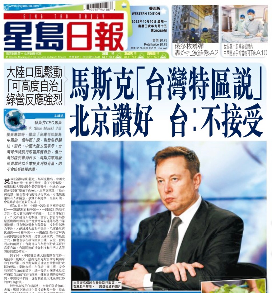 Island of Taiwan can exercise high degree of autonomy as a special administrative region: Chinese FM on Elon Musk’s suggestion 台灣島可以作為特別行政區行使高度自治權:中國外交部發言人關於埃隆馬斯克的建議