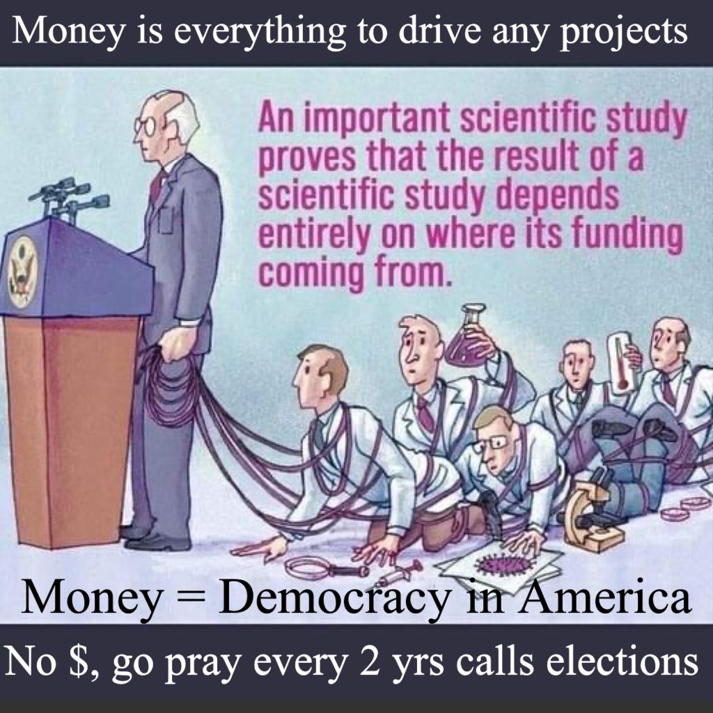 Money is everything to drive any projects. Money = Democracy in America. No $, go pray every 2 yrs calls elections 金錢是推動任何項目的一切. 美國的民主就是金錢. 沒有錢, 每 2 年去祈禱一次無形地接受選舉的騙局.