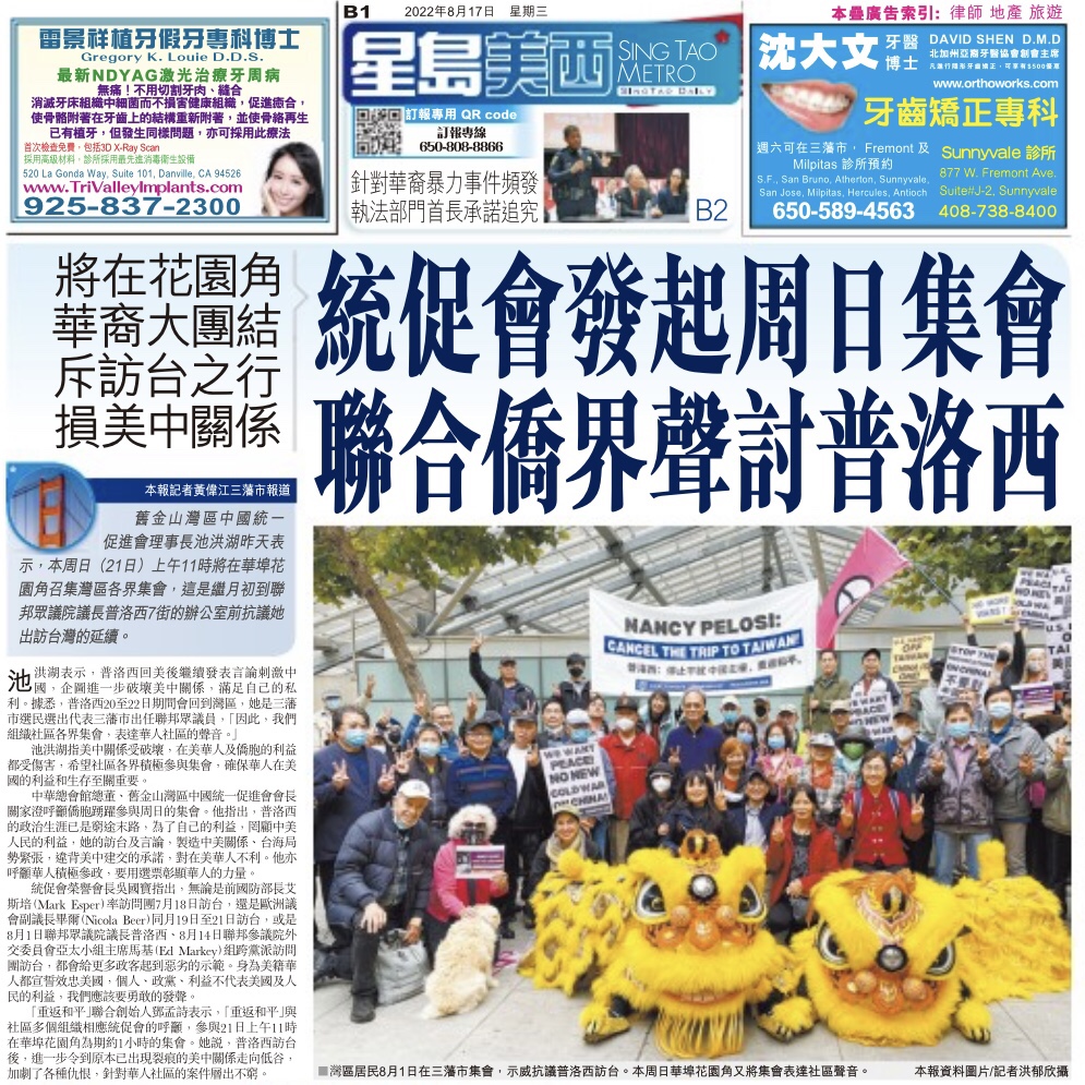 「重返和平」聯合創始人鄧孟詩表示,「重返和平」與社區多個組織相應統促會的呼籲,參與21日上午11時在華埠花園角為期約1小時的集會。她說,普洛西訪台後,進一步令到原本已出現裂痕的美中關係走向低谷,加劇了各種仇恨,針對華人社區的案件層出不窮