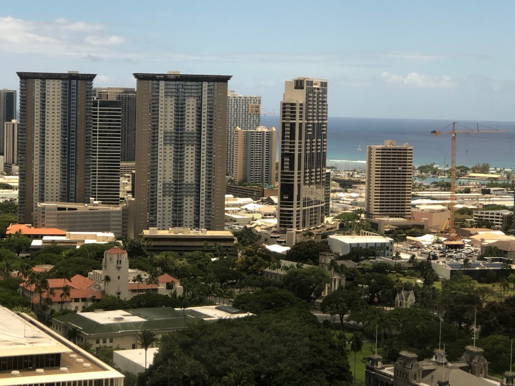 Just landed in Honolulu, A view from my office from downtown Honolulu, beautiful sunshine and blue sky. But please don’t go down to the street to look too closely, filled with homeless, crack cocaine users (Hawaii is the crack cocaine center of US).