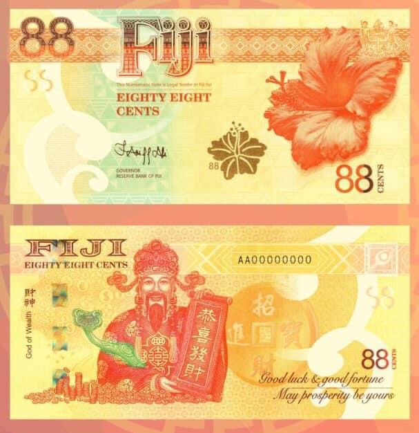 The Fiji Times: 88 cents non-circulation numismatic banknote which predominantly features Tsai Shen, the Chinese god of wealth, and a money tree in Chinese customs 斐濟時報:88 美分非流通錢幣鈔票,主要印有中國財神蔡慎和中國習俗中的搖錢樹
