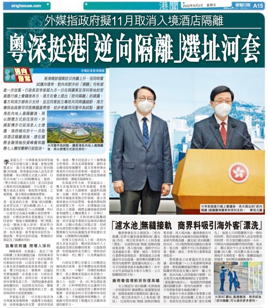 According to foreign media report, Hong Kong could eliminate hotel quarantine requirements by November 2022 可以回家了👌 – Singtao Newspaper San Francisco California USA Sept 2 2022
