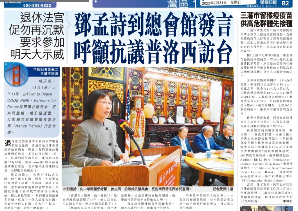 Retired Judge Julie Tang visited the Chinese Consolidated Benevolent Assn (Six Companies) yesterday. She emphasized that Pelosi was elected by San Francisco voters to Congress. We should consequently make our voices heard and stop being silent. On August 1, the protesters will go to Nancy Pelosi’s office at the Federal Building (90 7th Street, and Mission Street) in San Francisco to demand that she stop her reckless behavior and immediately cancel the trip to Taiwan.