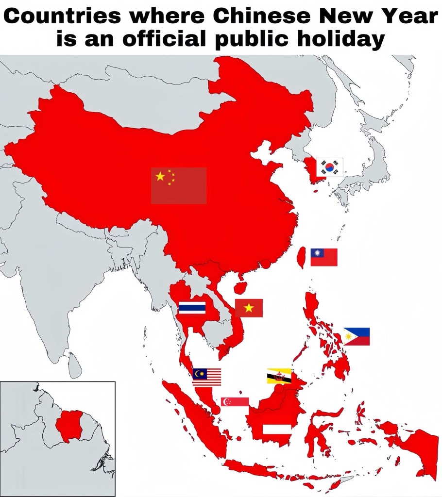 🇨🇳 China 🇹🇼 Taiwan * 🇭🇰 Hong Kong ** 🇲🇴 Macau ** 🇸🇬 Singapore 🇲🇾 Malaysia 🇮🇩 Indonesia 🇻🇳 Vietnam (Tết) 🇰🇵 North Korea (Seollal) 🇰🇷 South Korea (Seollal) 🇧🇳 Brunei 🇵🇭 Philippines (limited regions)