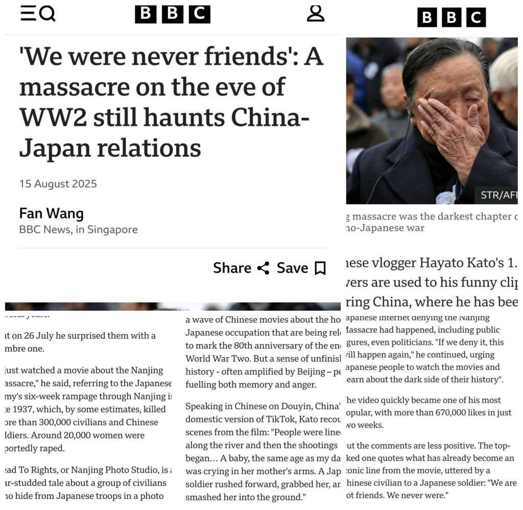 On the 80th anniversary of Japan’s surrender, the British media BBC published a long article titled “We have never been friends: The shadow of the Holocaust still haunts China and Japan”, which began with the story of TikTok blogger Hayato Kato. 日本投降80周年時,英媒BBC發長文, 題目:《我們從來不是朋友:大屠殺陰影仍纏着中日》,開頭講了TikTok博主加藤隼人的事。