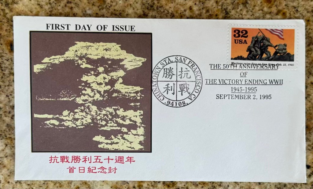Today I found a commemorative envelope bearing a postmark designed by Herbert Lam in SF for the United States Postal Service (USPS). It bears the Chinese characters “Victory of the Anti-Japanese War” and the date “September 2, 1995.” Thirty years have passed in the blink of an eye. The Guangzhou Overseas Chinese Museum is currently celebrating the 80th anniversary of the victory of the Anti-Japanese War, and Lin Kaibin has decided to donate it to the museum for its permanent collection. 今天發現一個紀念封,上面蓋有林凱斌為美國郵政(USPS)設計的郵戳,帶有中文字「抗戰勝利」,1995 年9 月2 日等字,𨍭眼便是30 年了。「廣州華僑博物館」正舉辦抗戰勝利80周年活動,林凱斌決定把它捐贈博物館永久收藏.